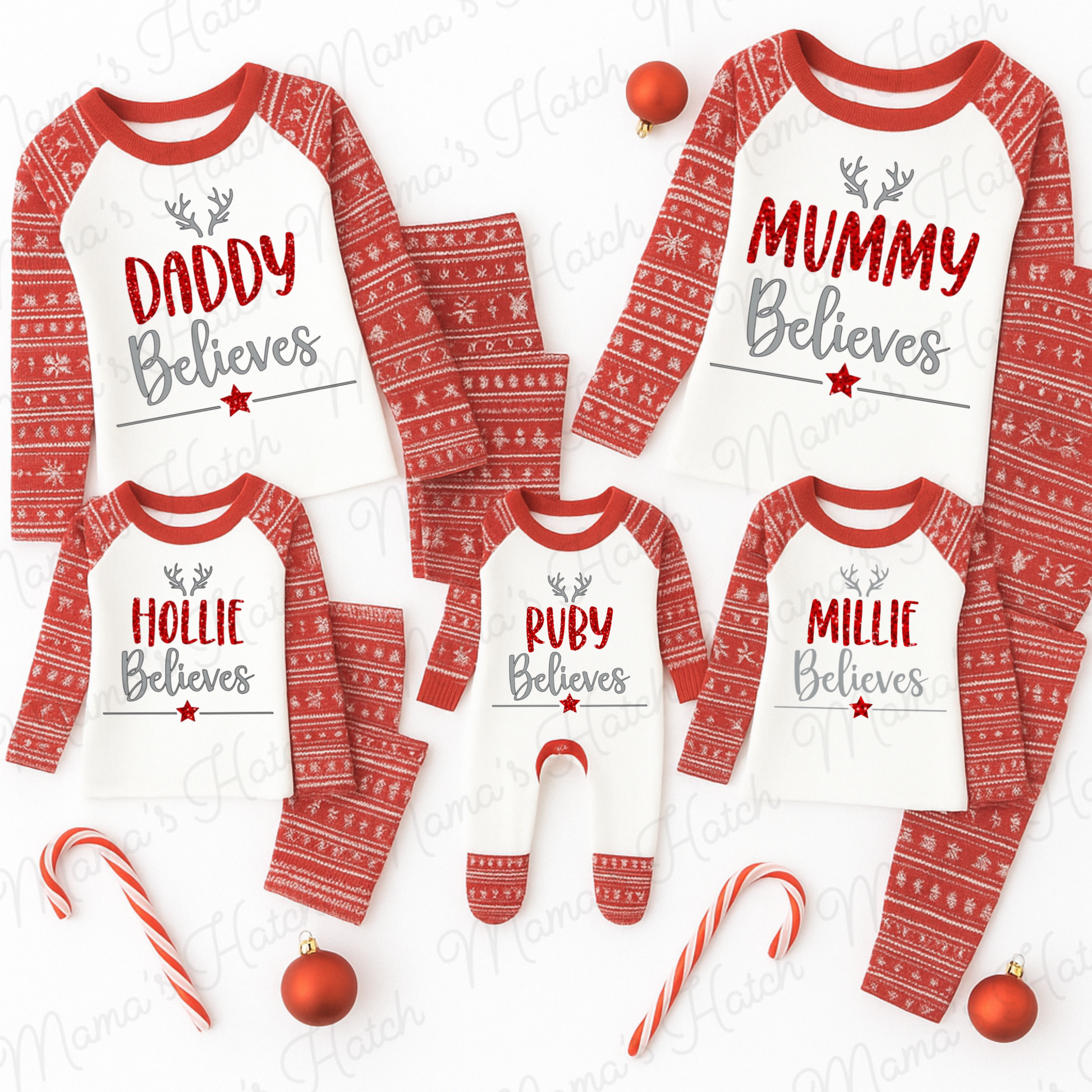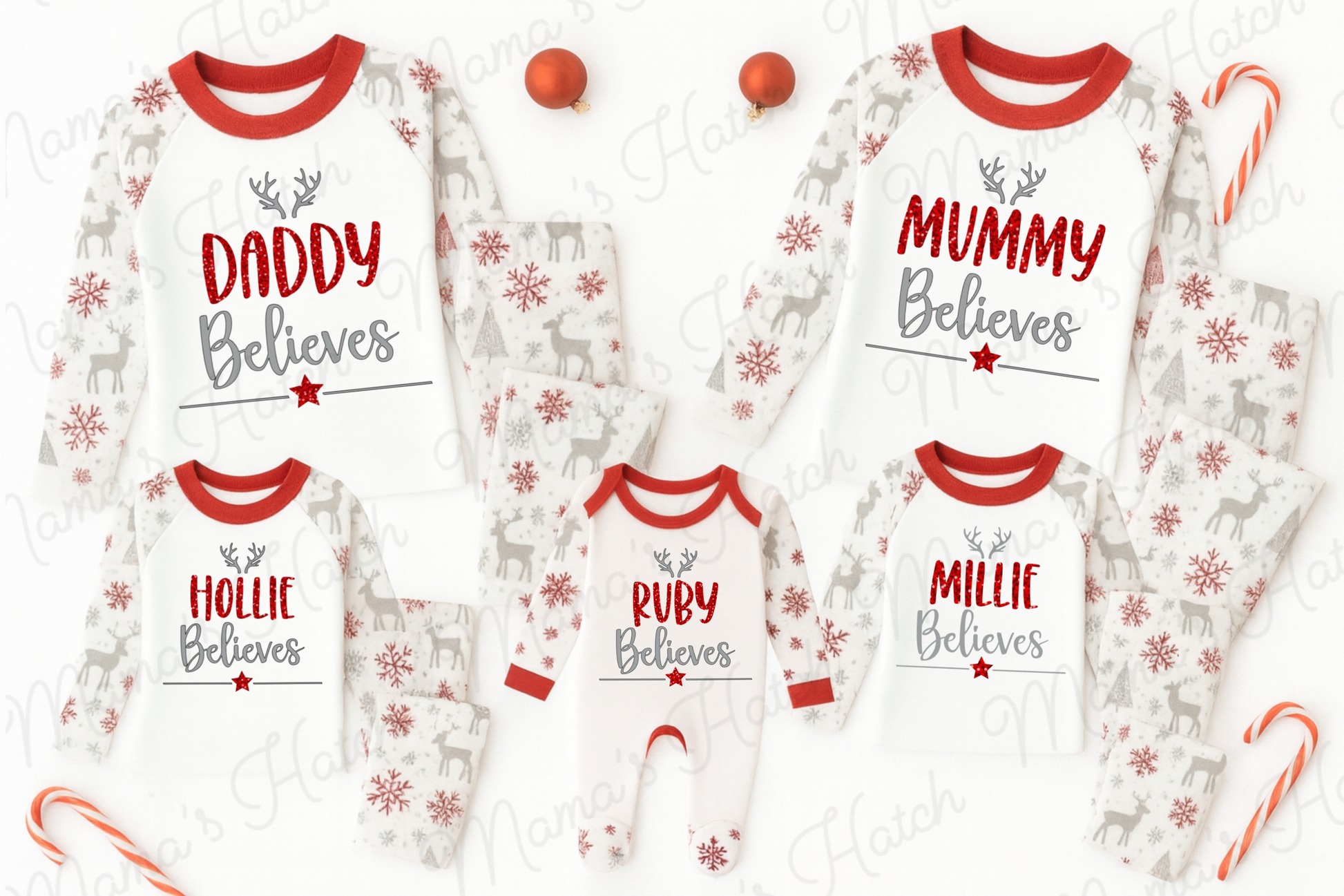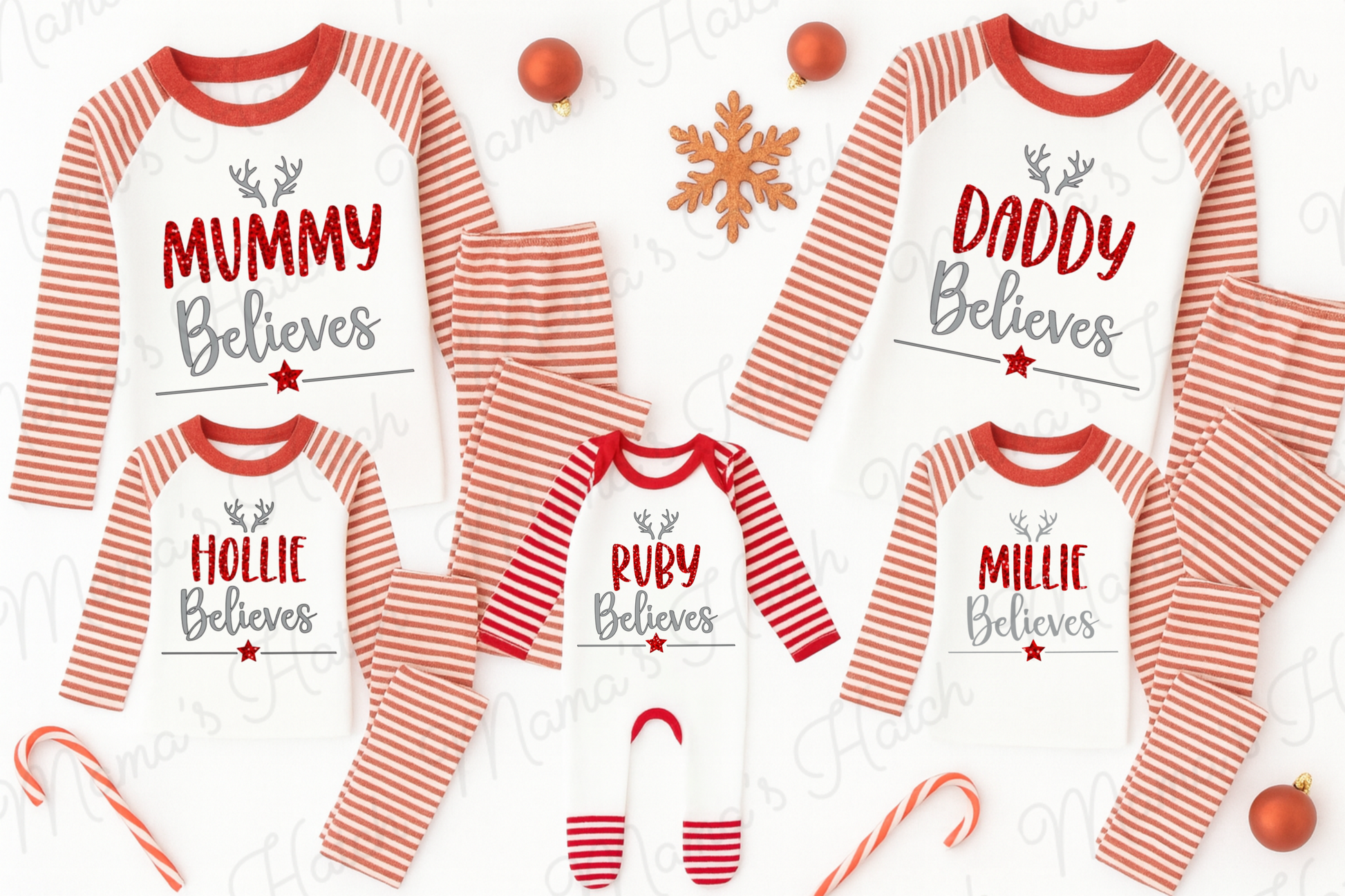 From Mummy Believes and Daddy Believes to your little ones’ names on their own PJs and baby’s romper, this matching bundle is made to bring your whole family together in festive style.